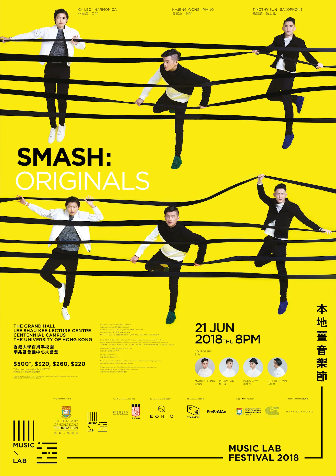 繼上年度廣獲好評,樂迷引頸以待的 SMASH 今年再下一城,與香港大學及多名本地作曲家合作,帶來變幻莫測的原創聲音。動人出眾的色士風手孫穎麟、活力四射的口琴手何卓彥、技巧多變的鋼琴家黃家正聯手演奏,與樂迷一起盡情地 Smash 一場,感受充滿激情和火熱的音樂會!
