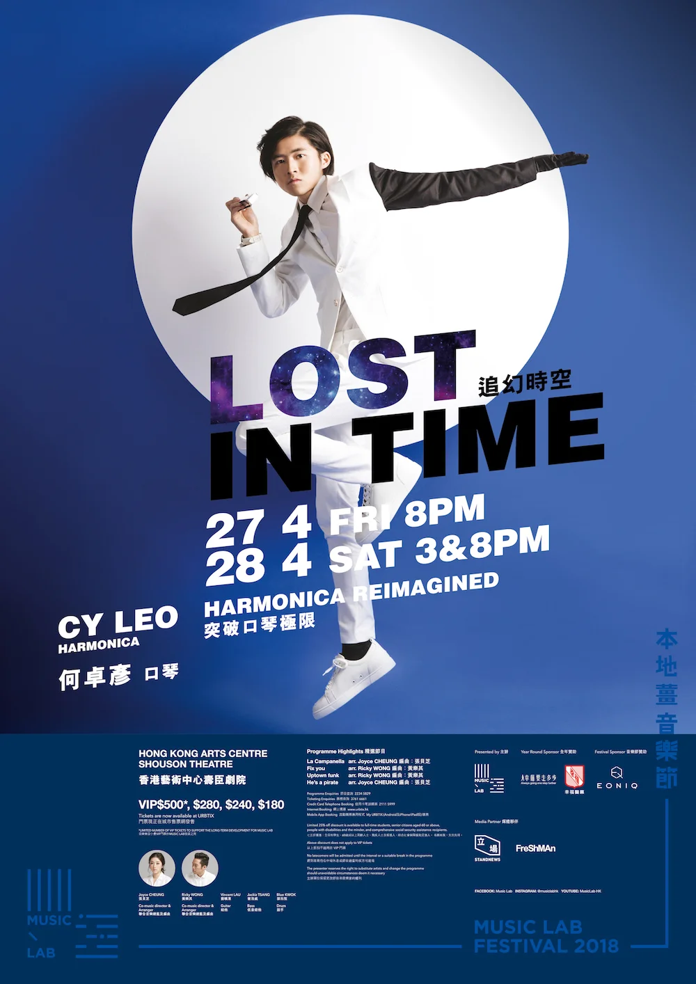 Harmonica world champion CY Leo will lead the project Lost in Time to start off our Music Lab Festival 2018. CY promises to deliver smashingly pleasurable listening experience by infusing the boundaries of signature pops in different eras, to be lost in time from classics to the modern pop.